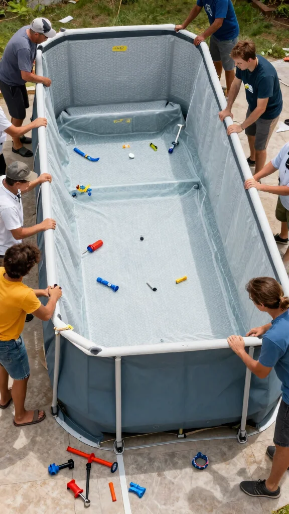 Once the frame is assembled, install the liner, taking care to avoid any creases or tears.