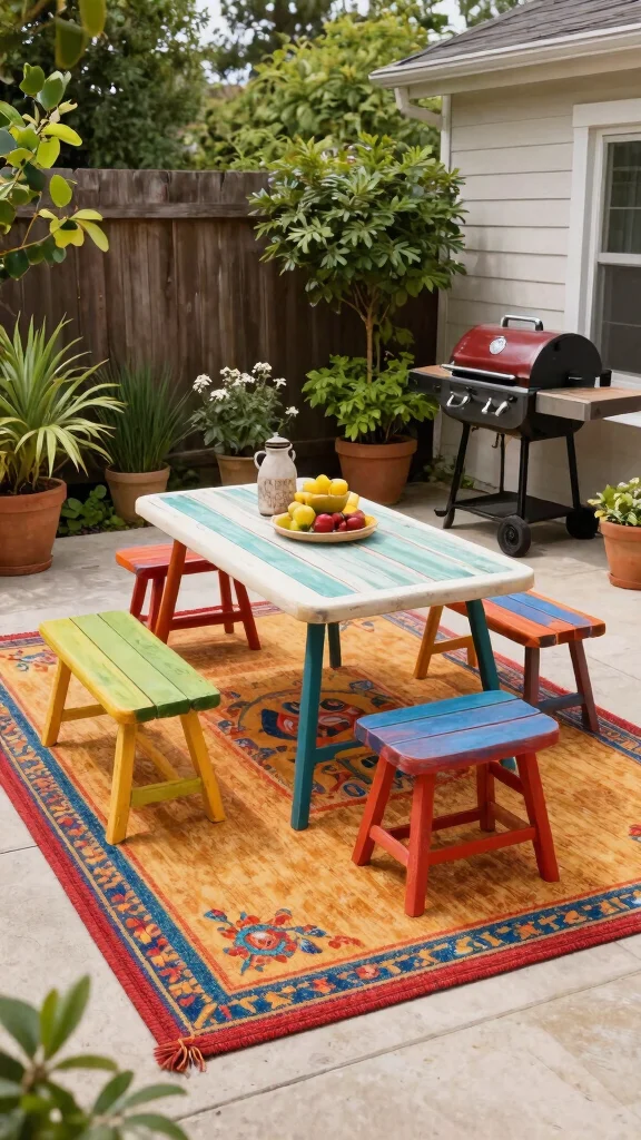 Give your small bbq area ideas outdoor a cozy upgrade with a weather-resistant rug. A polypropylene rug defines the space, adds warmth, and cleans easily—perfect for al fresco meals. Pick durable colors that fit your decor, and enjoy stylish, practical comfort.