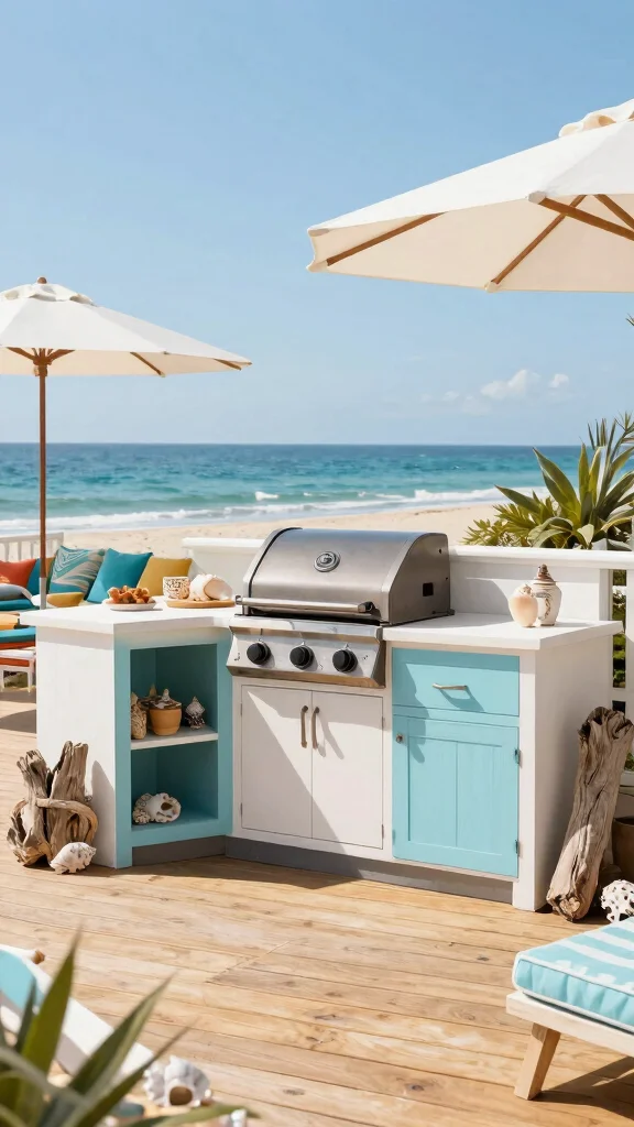 Do you love the relaxed vibe of the beach? Bringing coastal vibes to your BBQ covered area can turn every meal into a vacation experience. Think light blues, sandy tones, and breezy fabrics that evoke the seaside. Envision a wooden deck and a grill facing the ocean, creating the perfect backdrop for your outdoor cooking adventures.
