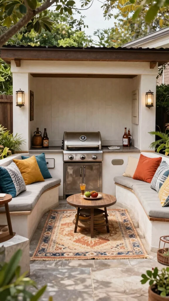 Built-in seating turns your bbq covered area grill station into a cozy hub where conversations flow as easily as the flame. It saves space, invites friends to linger, and cushions make every bite feel like a stay-at-home vacation.