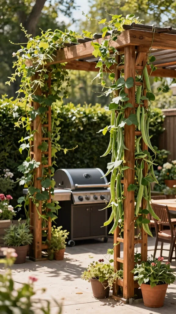 Want to add beauty and shade to your BBQ area? Vertical trellises are perfect for supporting climbing plants while creating a stunning visual element. Imagine beans and peas climbing high, providing a green curtain that not only beautifies but also cools your outdoor space. This addition enhances your grilling environment, making it more enjoyable and inviting.