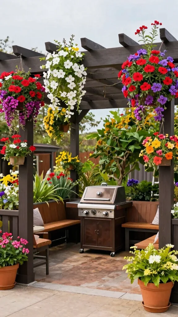 Picture yourself grilling under a stunning pergola draped in lush climbing vines like wisteria or grapevines. This rustic design creates a cozy and inviting atmosphere, seamlessly connecting your cooking area with nature. As sunlight filters through the leaves, it bathes your space in a warm glow, making every BBQ feel special and serene.