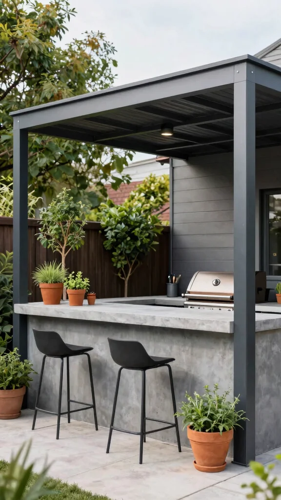 To enhance the modern vibe, pair your metal pergola with a concrete countertop and stylish bar stools. Add potted herbs or small trees to introduce a splash of greenery that beautifully contrasts with the metal. This design is particularly suitable for smaller backyards, optimizing space without sacrificing style.