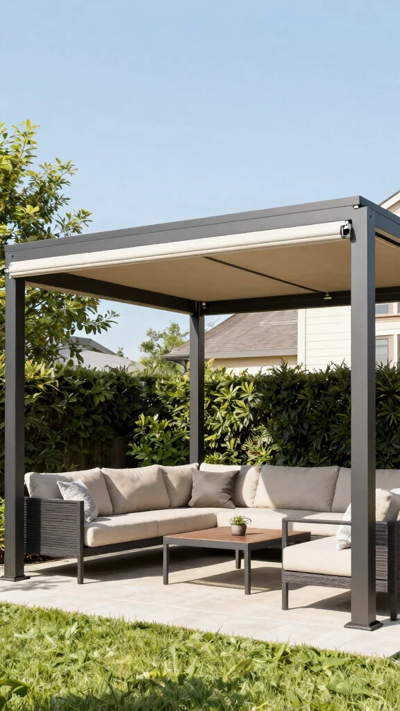 While the retractable canopy is versatile, some may prefer the rustic charm of climbing vines or the modern appeal of a minimalist metal structure. If you’re focused on eco-friendliness, an eco-friendly bamboo pergola is also a solid choice. Each option has its strengths that cater to different tastes and needs, giving you the freedom to choose what fits best in your backyard setting.