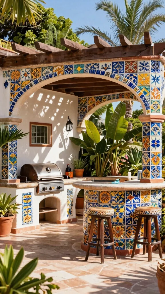 Incorporate a built-in grill and a bar counter with stools for easy serving of delicious meals. Surround the space with lush potted plants to enhance the tropical feel, creating a perfect backdrop for summer gatherings or family feasts.