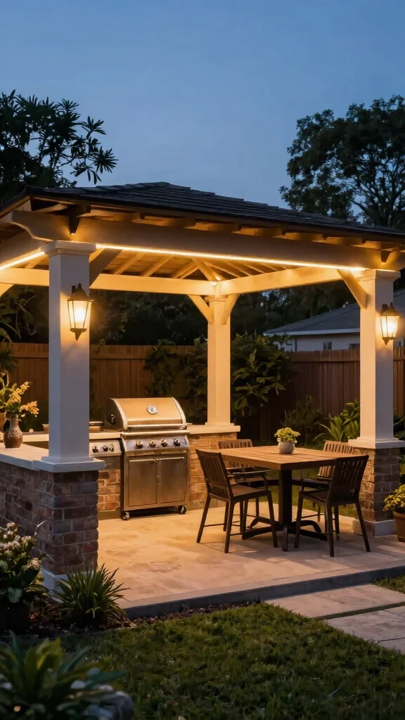 Enhance comfort with built-in seating featuring soft cushions, allowing guests to gather while you grill. A small table for drinks and snacks can complete this cozy entertaining area. String lights overhead to add a festive touch for evening BBQs.