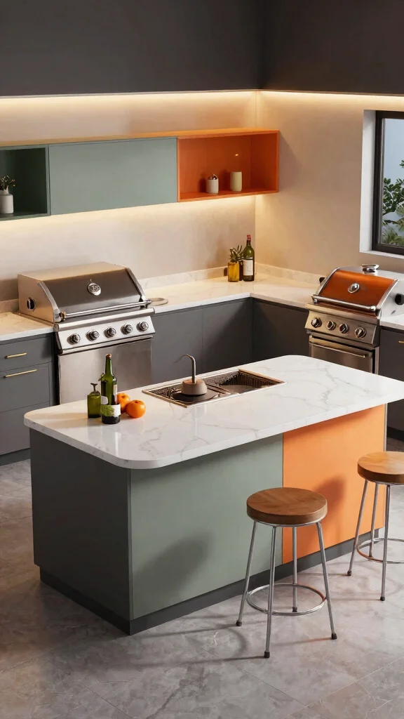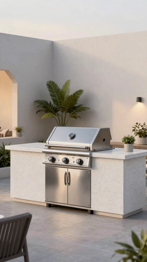 Imagine hidden storage for your grilling tools, built-in lighting for evening cookouts, and even an optional smoker for those smoky flavors you love. This design is all about simplicity, giving you everything you need without the clutter. You can brighten the space with colorful dishware or vibrant plants for a refreshing touch.