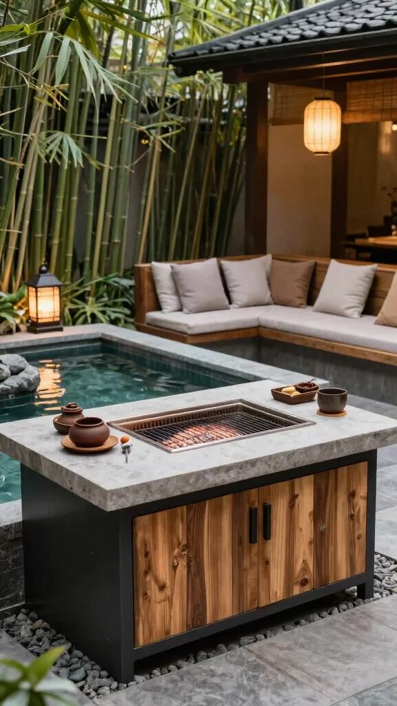 Imagine a built-in grill designed for charcoal or wood, a tranquil pond or water feature, and Asian lanterns to complete the ambiance. This space not only serves delicious grilled dishes but also transforms your outdoor area into a peaceful retreat.