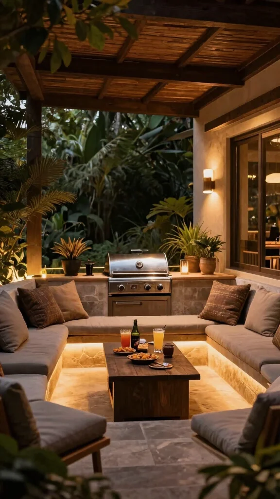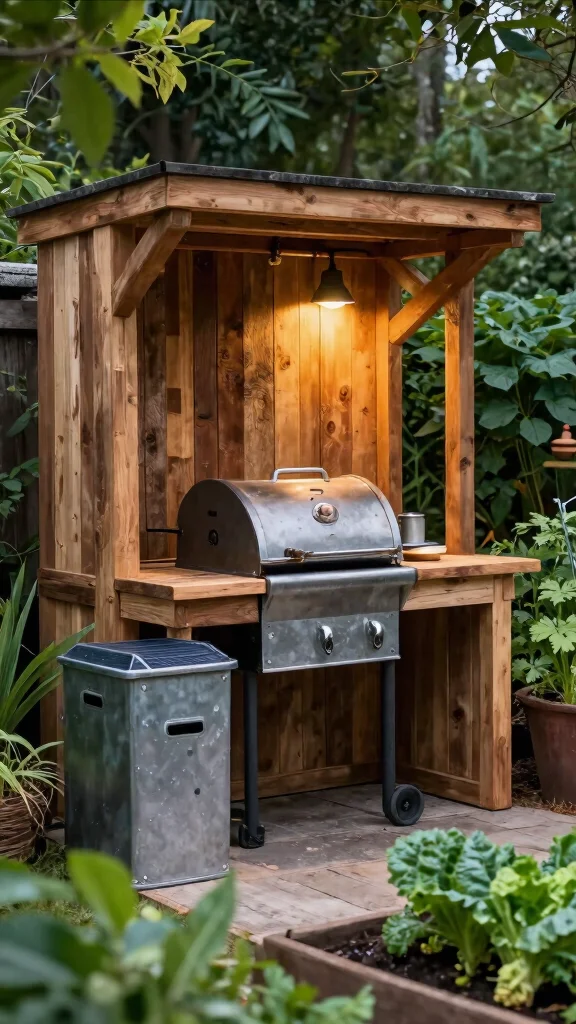Using reclaimed wood or recycled metals, a compost bin for waste, and solar-powered lighting, this setup encourages thoughtful consumption. You can even grow a small vegetable garden nearby to complement your grilling.
