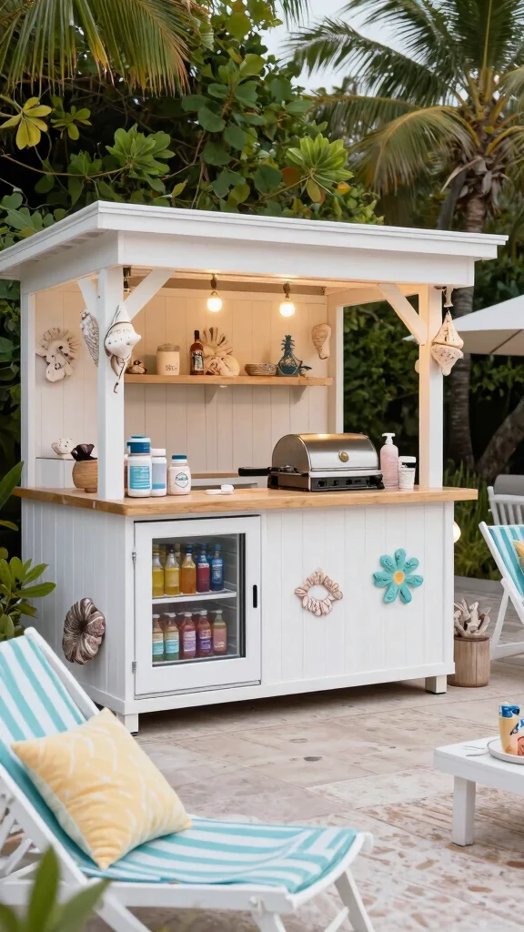 This BBQ station features weather-resistant materials and a built-in cooler to keep your drinks chilled. Decorative touches like driftwood and seashells add to the ambiance, encouraging relaxation after a sunny day. Enhance the area with beach-style lounge chairs and colorful throw pillows for the perfect coastal retreat.