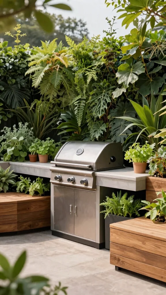 With built-in vertical planters for herbs and small vegetables, a stylish modern grill, and seating that blends seamlessly into the garden, this setup creates an inviting atmosphere for culinary creativity. You can easily reach for fresh basil, mint, or tomatoes while you cook, elevating your meals to new heights.