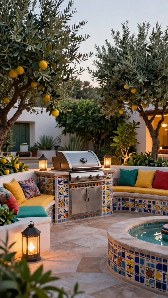 This setup includes colorful tilework around the grill, comfortable built-in seating with soft cushions, and a bar area for serving drinks and snacks. The inviting visuals and delicious aromas of grilled seafood will surely impress your guests, while nearby olive trees or citrus plants enhance the atmosphere.