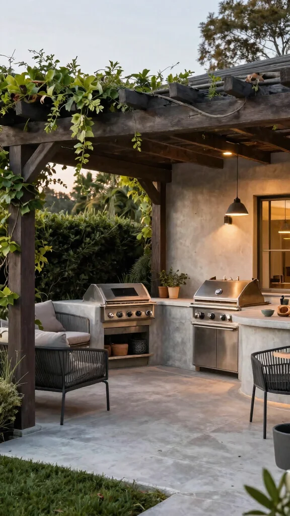 Use climbing plants to soften the structure and bring a touch of nature into your BBQ area. Comfortable lounge furniture under the pergola invites relaxation, while ensuring the structure is positioned to optimize airflow around your cooking area enhances usability.