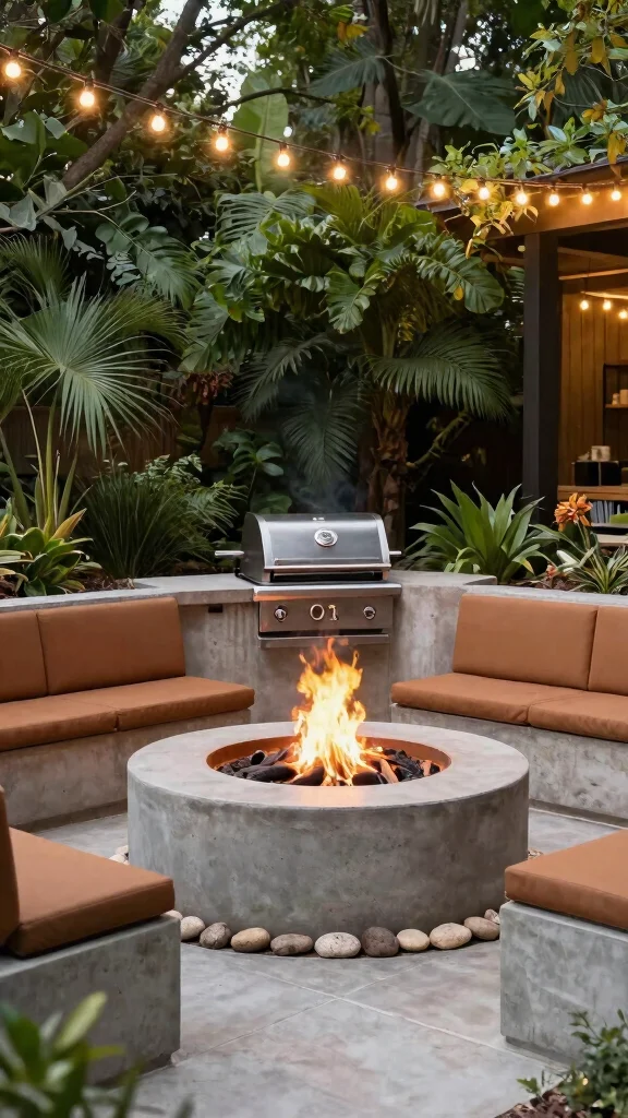 Combine a concrete fire pit with your BBQ setup for a cozy ambiance and multi-functional outdoor living.
