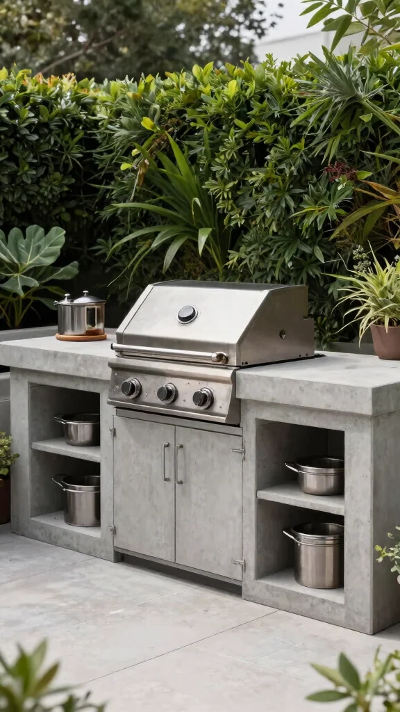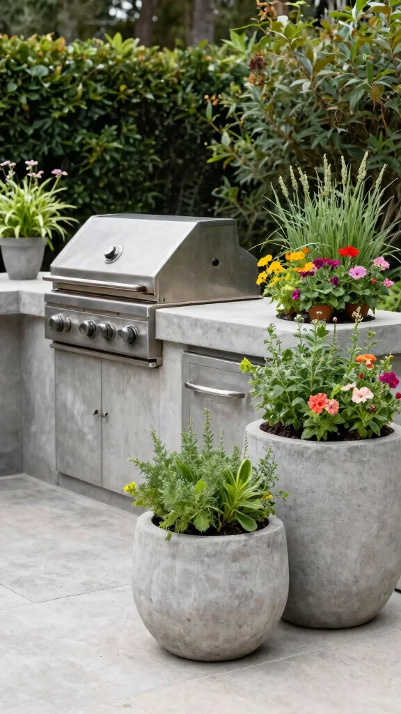 Design your BBQ area with stylish concrete planters to enhance aesthetics and integrate greenery into your cooking space.