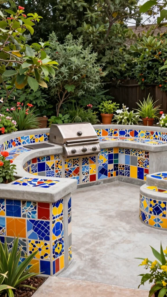 Mosaic Concrete BBQ Concrete, Mosaic Tiles Artistic designs Coordinate colors with garden