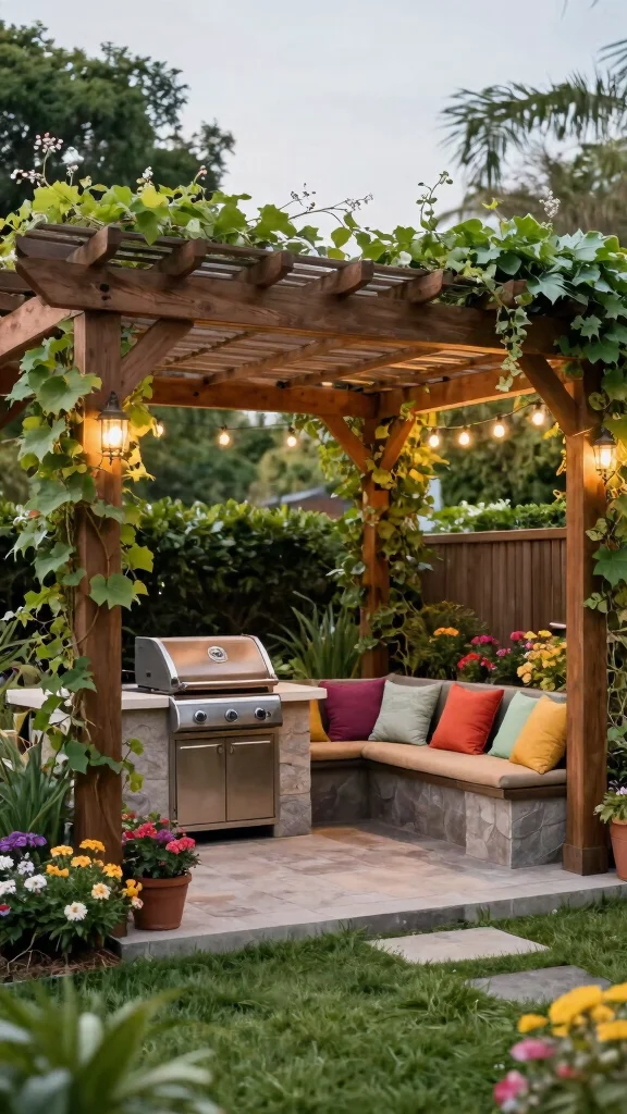 Did you know that a pergola with climbing plants can cut heat by 15–20% and boost outdoor dining time? Integrate jasmine or grapevines and string fairy lights for that magical, cozy retreat—perfect for covered bbq area ideas outdoor.