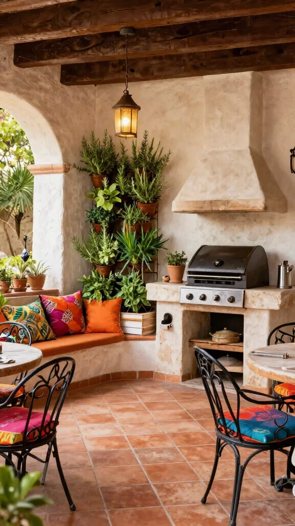 Incorporating a vertical garden featuring Mediterranean herbs like rosemary, thyme, and basil not only enhances the atmosphere but also adds fresh flavors to your meals. You can set up a stone grill or a traditional BBQ pit for an authentic cooking experience.