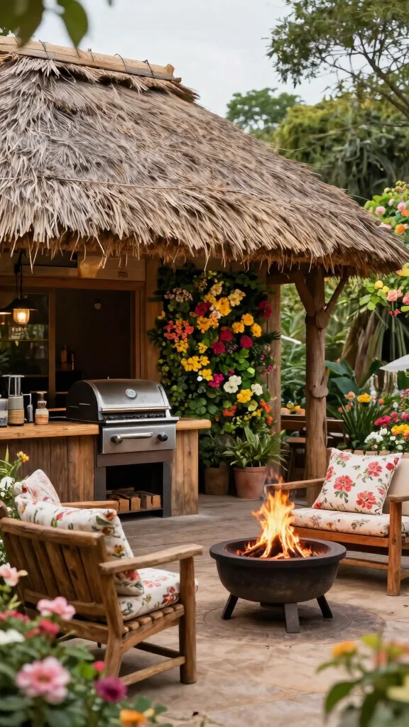 Turn your backyard into a tropical paradise: embrace covered bbq area ideas outdoor with a palm-inspired setup. Plant a vertical garden with tropical herbs and add a tiki bar for vacation-worthy entertaining.