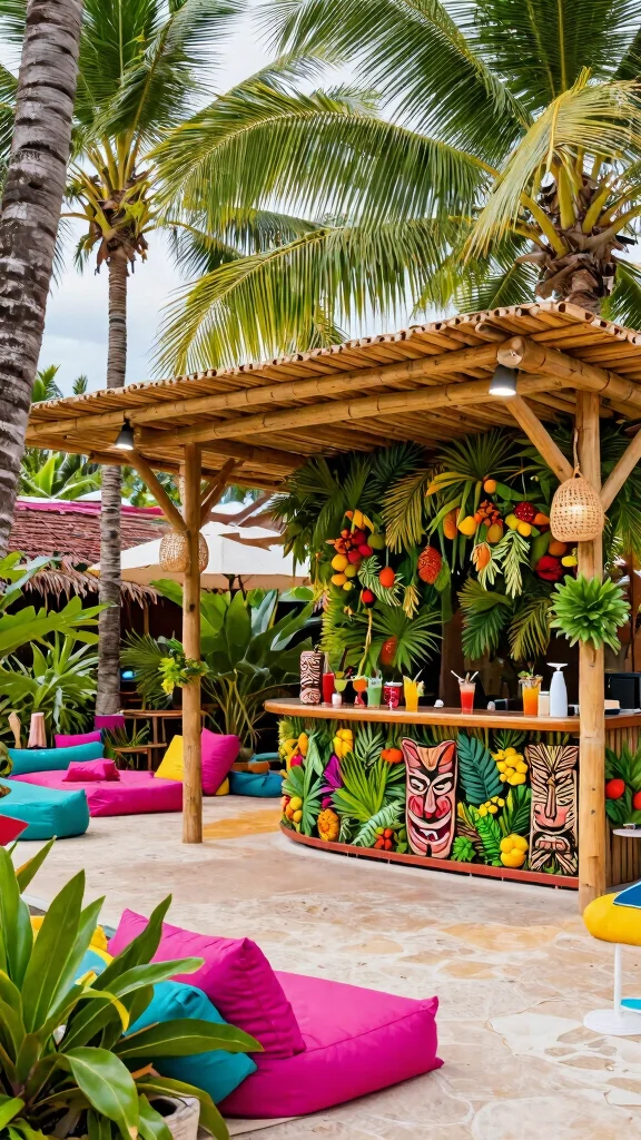 Incorporating tropical plants will create an inviting ambiance, while bamboo elements can enhance the overall structure. Consider adding a small outdoor fridge for drinks and comfortable loungers for relaxation, making this tropical retreat a fun and lively space for entertaining.