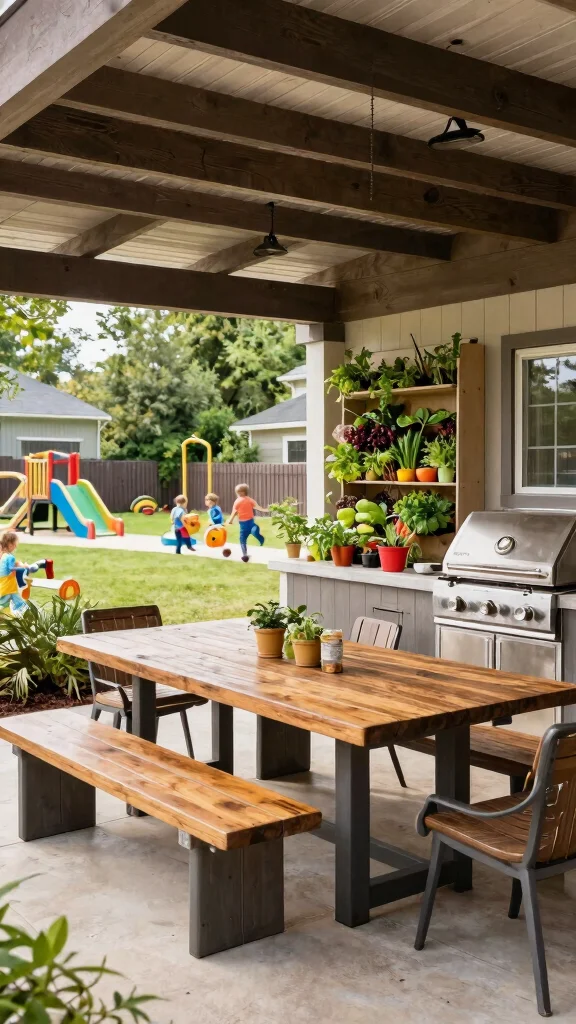 Turn your covered BBQ area into a family hub—kids can explore the vertical garden while you grill, and a big table keeps everyone close for meals and games. With kid-friendly herbs and durable materials, open-air cooking becomes easy, safe, and endlessly enjoyable.