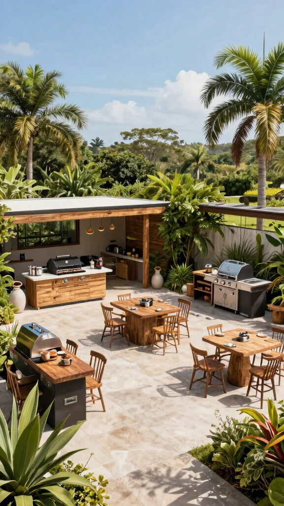 Ready to escape to a tropical paradise right in your backyard? A covered BBQ area surrounded by palm trees can transform your outdoor space into a relaxing island getaway. Picture vibrant colors in your decor and a vertical garden bursting with tropical fruits and herbs.