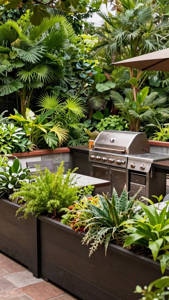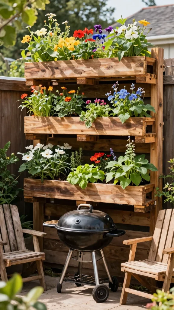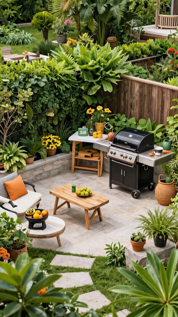 Utilize vertical space with planters or trellises to maximize greenery in your BBQ area.