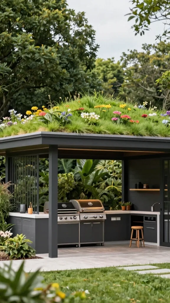 Think beyond traditional designs by adding a BBQ pavilion topped with a green roof. This innovative feature not only insulates your cooking area but also offers a stunning visual appeal. Imagine grilling juicy burgers while enjoying the lush greenery above you. This eco-conscious design helps reduce heat in urban spaces, making it both beautiful and functional!