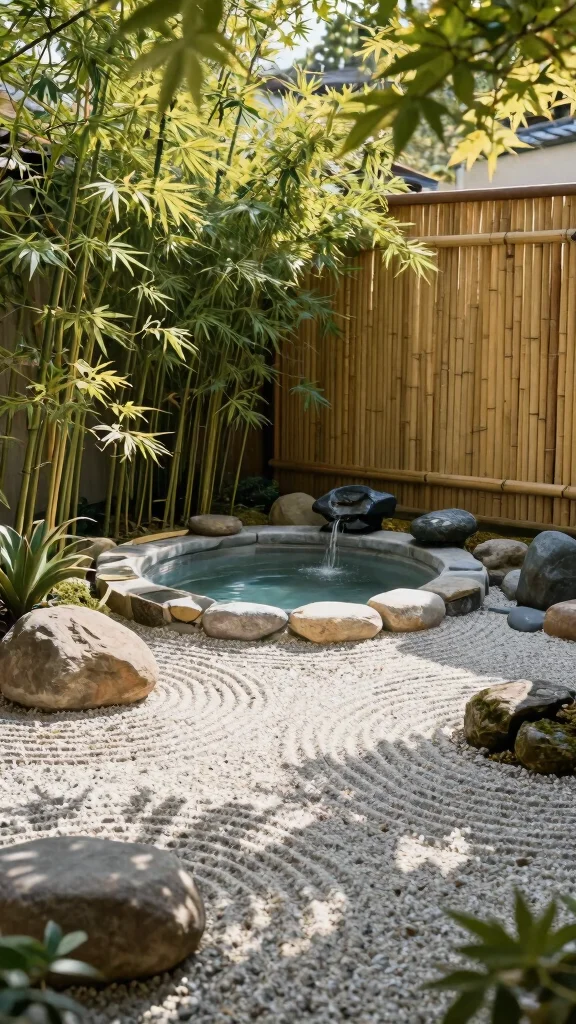 Begin by placing a bamboo privacy screen to ensure intimacy while enjoying nature. The soothing sounds of water and rustling leaves can help you unwind after a busy day.
