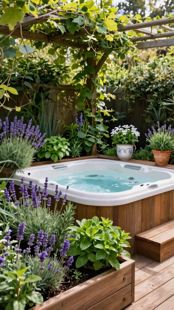 Consider raised beds or vertical gardens for easy access to herbs without sacrificing space. A trellis with climbing plants can add shade and charm. The combination of herb scents and warm water creates an immersive sensory experience.