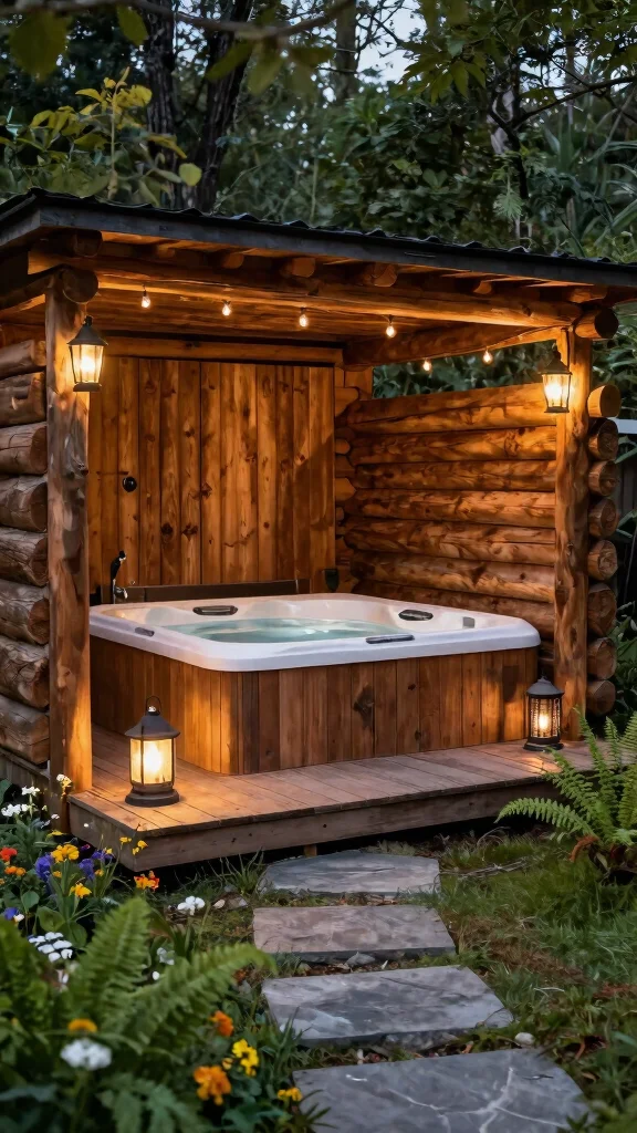 Fun fact: a rustic log cabin hot tub setup with reclaimed wood and lantern lighting turns any backyard into a retreat in minutes. Add native plants and warm string lights to deepen the calm and make your hot tub garden ideas feel instantly magical.