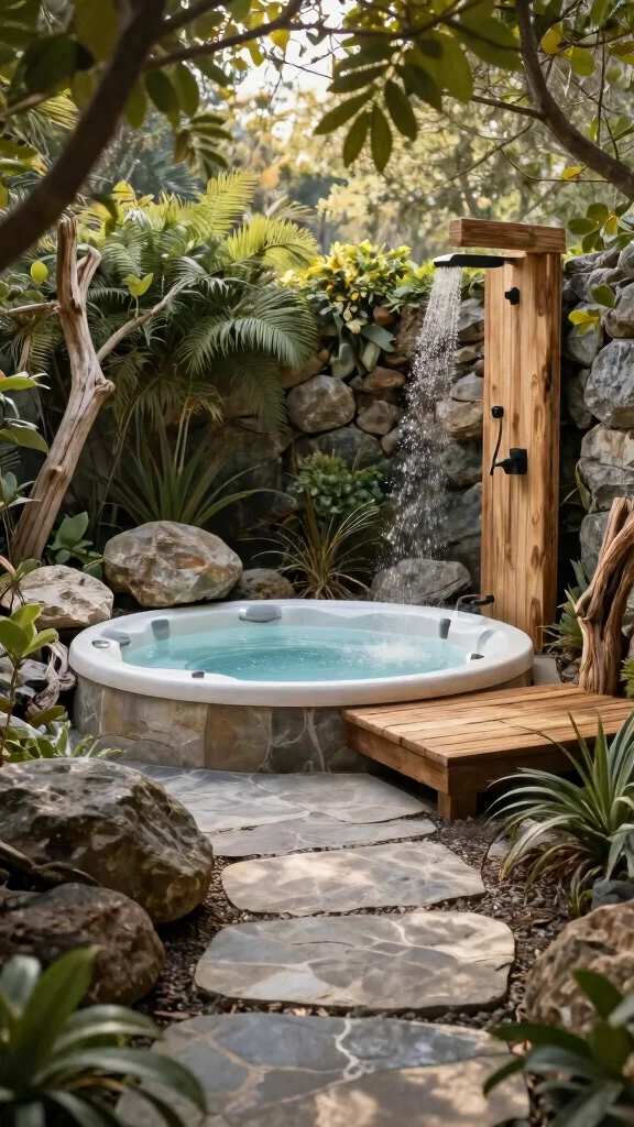 Adding boulders or driftwood can enhance the organic feel of the space. Consider an outdoor shower made from natural materials for a refreshing rinse before your soak.