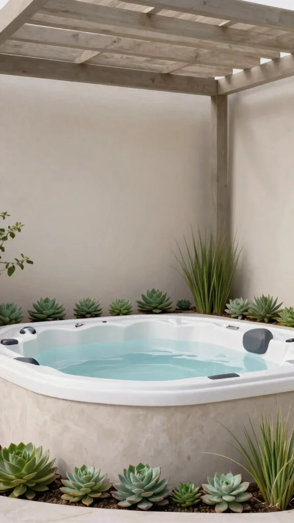 Embrace simplicity with a chic, minimalist hot tub garden. Choose clean lines and a neutral color palette for your hot tub and surroundings. Sparse plantings of carefully selected succulents or ornamental grasses add a touch of greenery without cluttering the space.