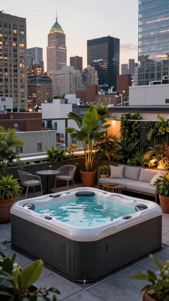 Transform a city rooftop into a relaxing escape with plants and a compact hot tub setup.
