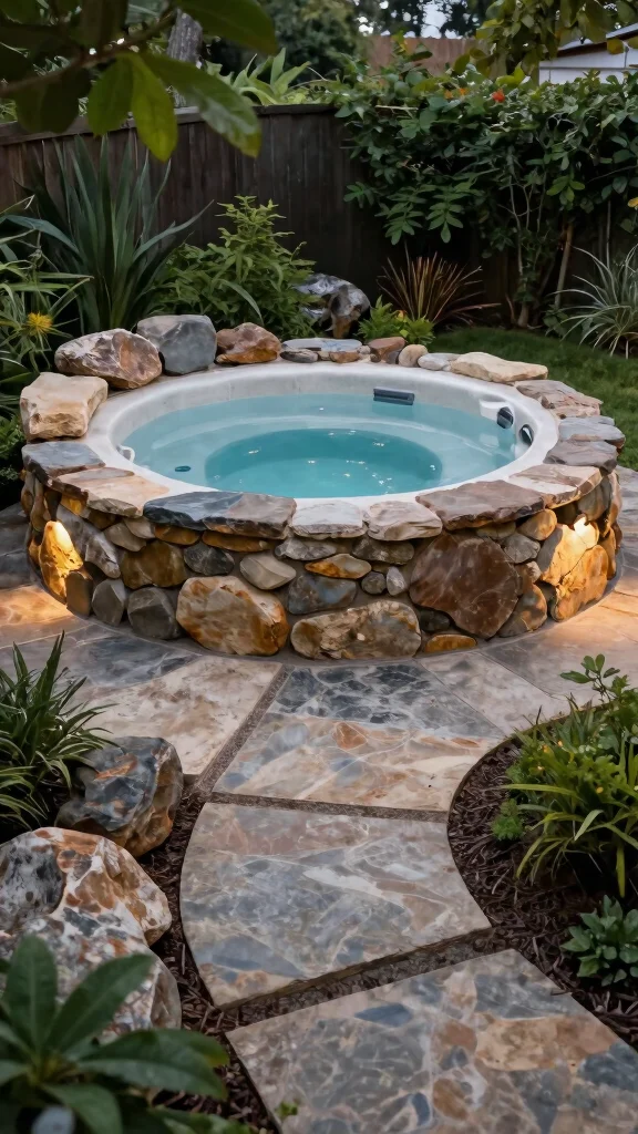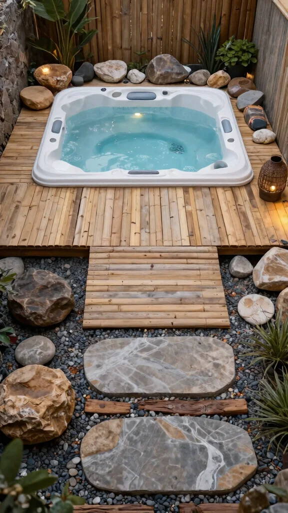 Consider using large stones to outline your hot tub area and smaller stones to create charming paths. Combining stones with gravel or mulch adds texture and a layered look, elevating your outdoor design.
