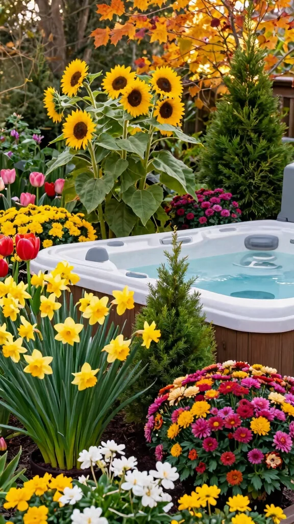 Consider planting early bloomers like daffodils and tulips for spring, sunflowers and daylilies for summer, and chrysanthemums for fall. Mixing heights in your garden adds depth, while evergreens maintain visual interest during winter months. Planning your layout ensures that plants complement rather than overshadow your hot tub.