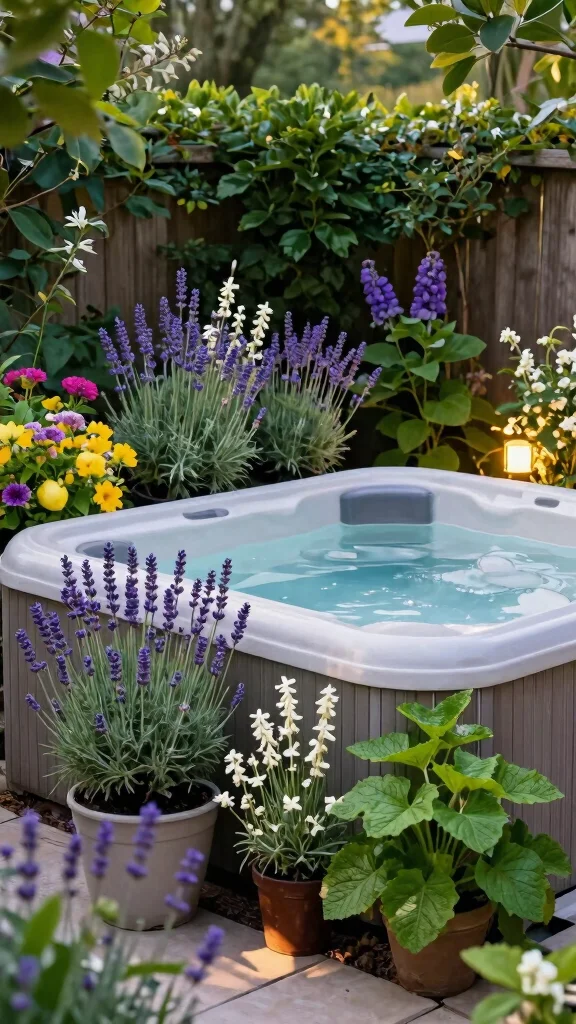 Surround your hot tub with aromatic plants like lavender and mint for a relaxing sensory experience.
