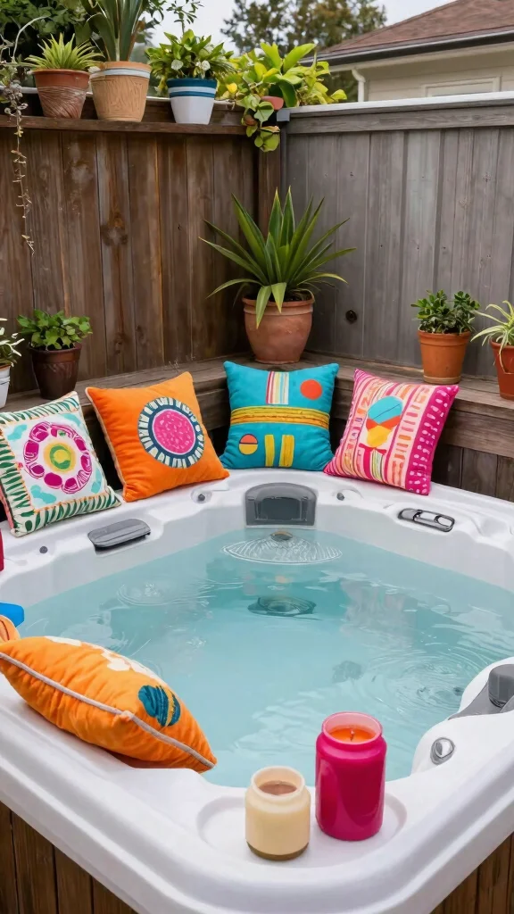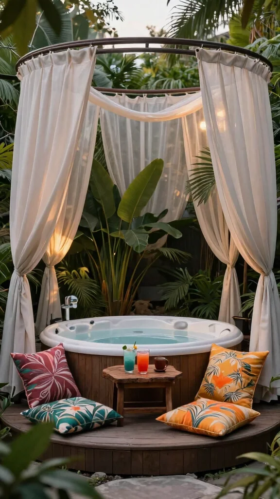 Imagine a small nook in your backyard, transformed into a dreamy retreat with a hot tub as the focal point. By using affordable outdoor fabric, you can create a curtain that wraps around this space, offering both privacy and a cozy vibe. Choose soft, inviting colors and add a few budget-friendly cushions and a petite side table for your drinks and snacks, making the area perfect for relaxation.