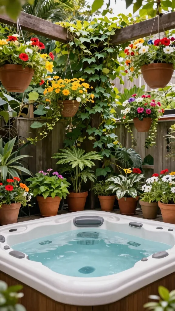 Fun fact: Greenery on a budget can boost perceived space by up to 30% and soften outdoor noise by a few decibels. Mix potted plants, hanging baskets, and climbing vines to create a fragrant, garden-like escape for your hot tub patio ideas on a budget.