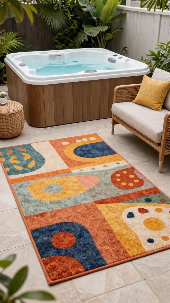 Adding an outdoor rug to your hot tub patio enhances comfort and visually defines the area. Look for rugs made from weather-resistant materials that can withstand the elements while establishing a welcoming ambiance. Vibrant colors or playful patterns can inject personality, encouraging relaxation in your space.