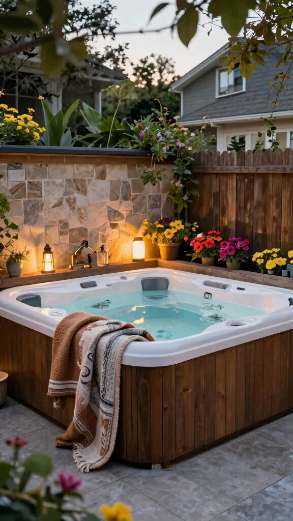 Enhance the atmosphere by adding potted plants around the hot tub, opting for easy-to-care-for herbs or succulents that suit your climate. This design not only provides intimacy but also elevates your hot tub experience in a tranquil setting. Focus on selecting materials that are easy on your wallet while ensuring comfort and style.