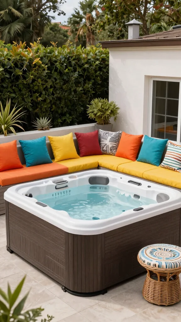 Fun fact: DIY refreshes of thrifted patio furniture can save up to 60% compared with new, mass-made pieces. For hot tub patio ideas on a budget, mix styles to create an eclectic vibe that still feels cohesive. Lightweight, weather-resistant options with colorful cushions make gatherings effortless.