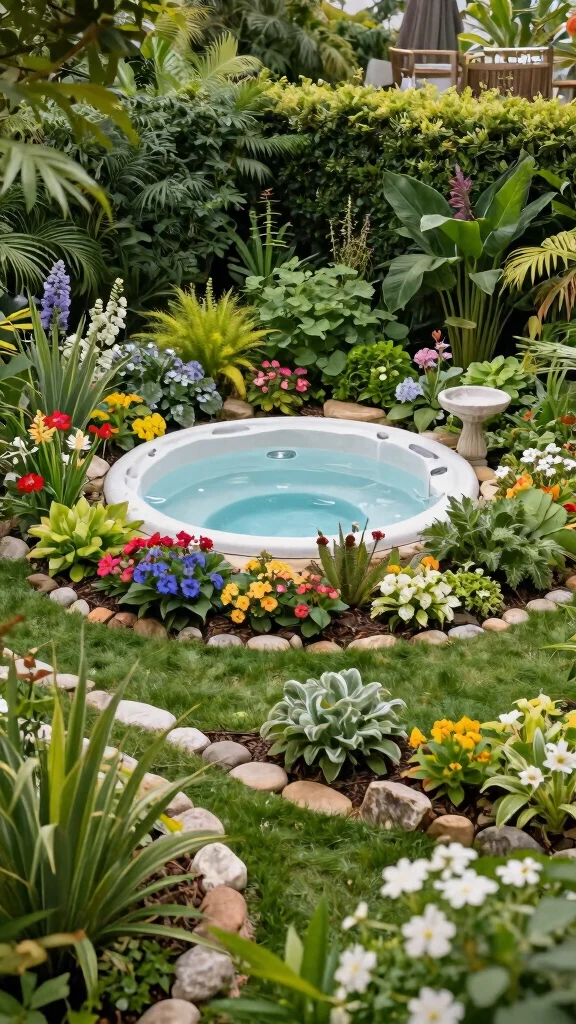 Transform your hot tub area into a lush garden oasis with a variety of plants that thrive in your climate. Incorporate fragrant flowers and vibrant foliage in both pots and garden beds, using affordable edging stones or bricks for definition. This adds a beautiful touch while creating a sense of privacy around your hot tub.