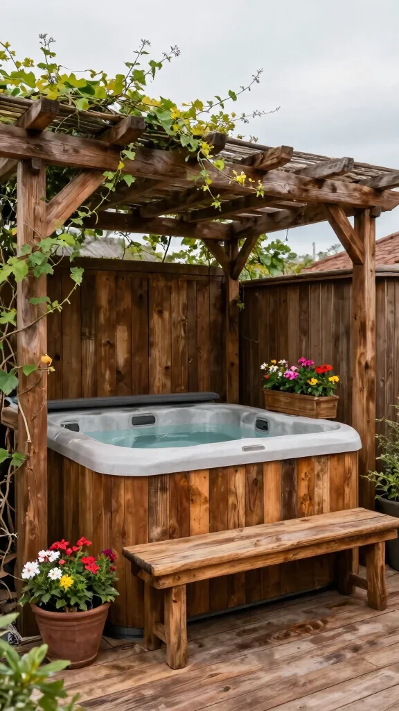 Creating a hot tub patio with reclaimed wood is a smart way to save money while adding character to your space. Craft a rustic bench from old pallets or salvaged planks, giving your area a unique charm. Surround the hot tub with recycled wooden planters filled with seasonal flowers or herbs for a vibrant touch.