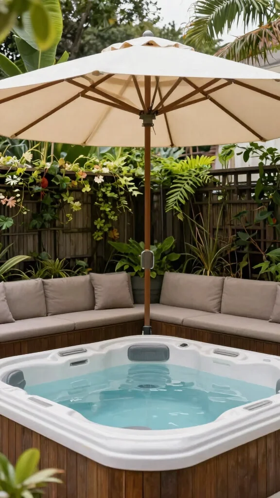 Planting tall trees or installing trellises with climbing plants can also create natural shade, enhancing the overall garden aesthetic. This not only protects your hot tub from debris but also contributes to the lushness of your patio.