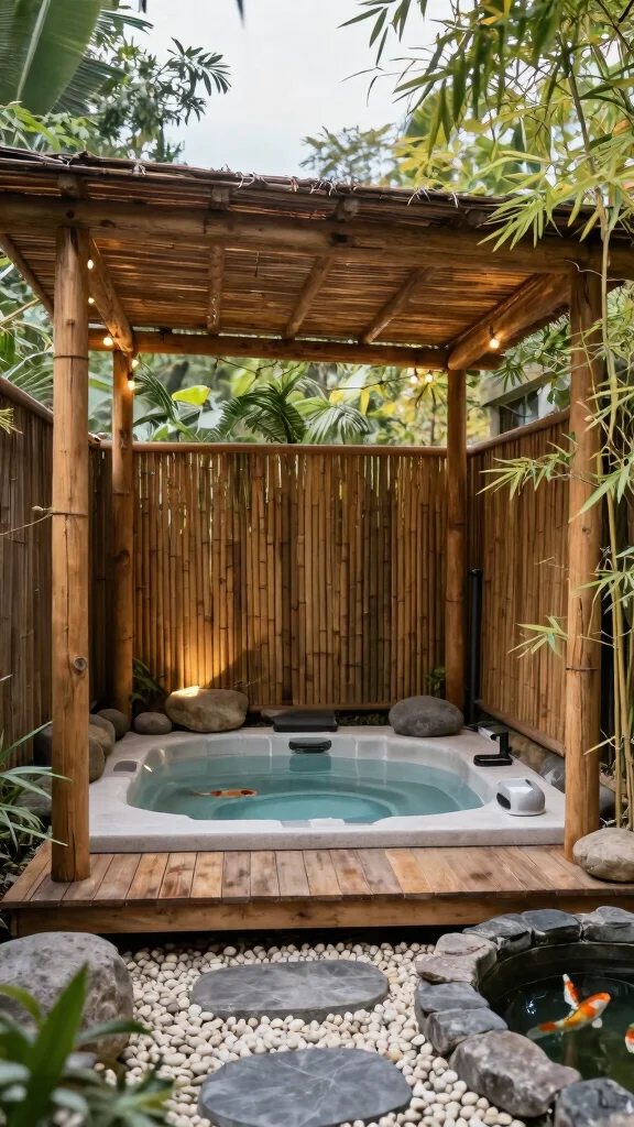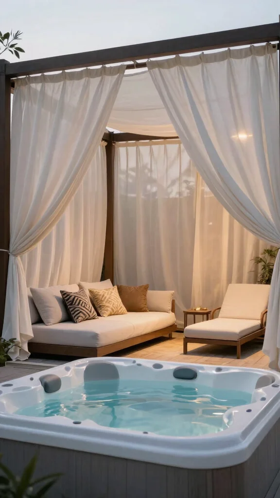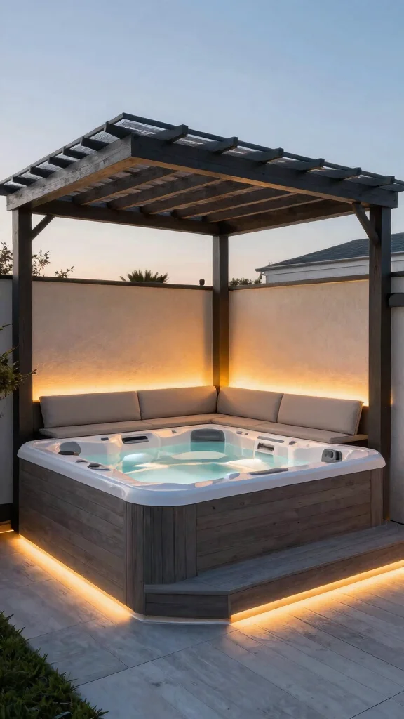 Create ambience with layered lighting: dimmable overhead LEDs, warm under-roof strips, and underwater spa lights for mood. For privacy, use lattice panels with climbing vines, tall evergreen screens, or weather-ready outdoor curtains. Add soft landscape lighting along pathways and consider a small water feature to heighten the sense of calm in your relaxation spaces. Ensure all wiring is outdoor-rated and tucked away for a clean, serene outdoor living setup.