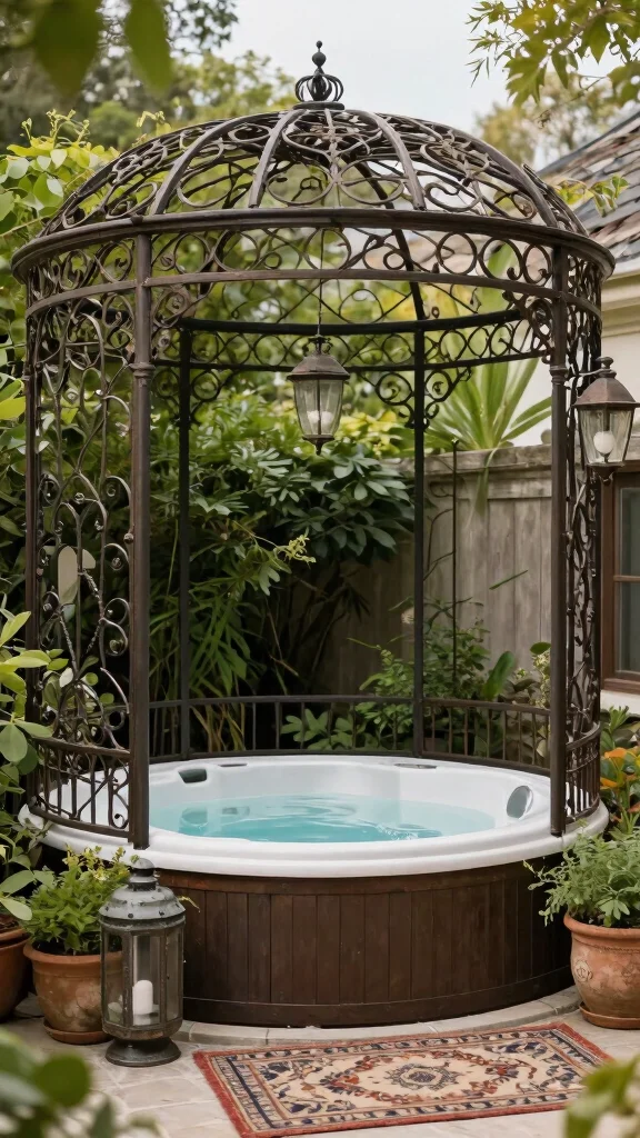 Capture the essence of a bygone era with a vintage charm pergola. This design often incorporates wrought iron or decorative metalwork, adding elegance and nostalgia to your hot tub area. Vintage-style furniture and accessories enhance the romantic atmosphere, making it perfect for quiet evenings of relaxation.
