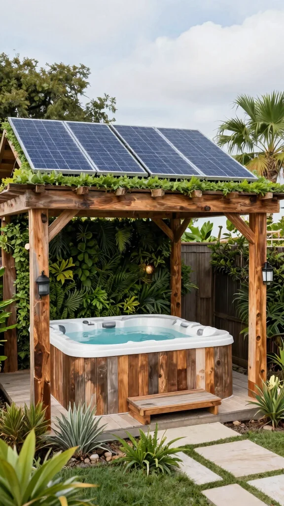 Design a sustainable oasis with an eco-friendly pergola that focuses on using reclaimed or sustainably sourced materials. This approach minimizes environmental impact and helps your hot tub blend seamlessly into the landscape.