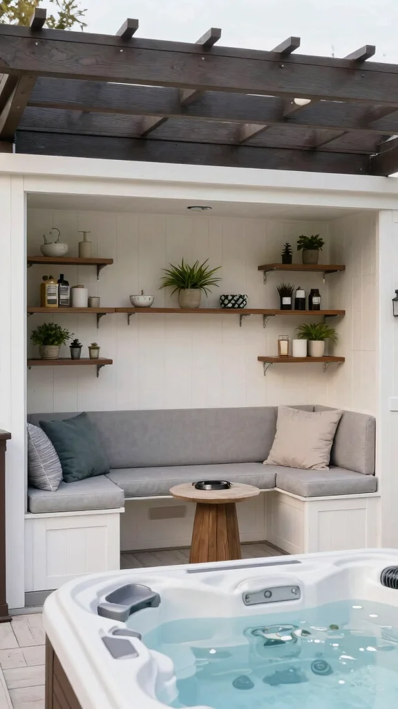 Maximize your outdoor space with custom built-ins that surround your hot tub. This concept enhances functionality while adding a personal touch to your outdoor oasis. Built-in seating, decorative shelves, and small tables for drinks create a cohesive and inviting area.