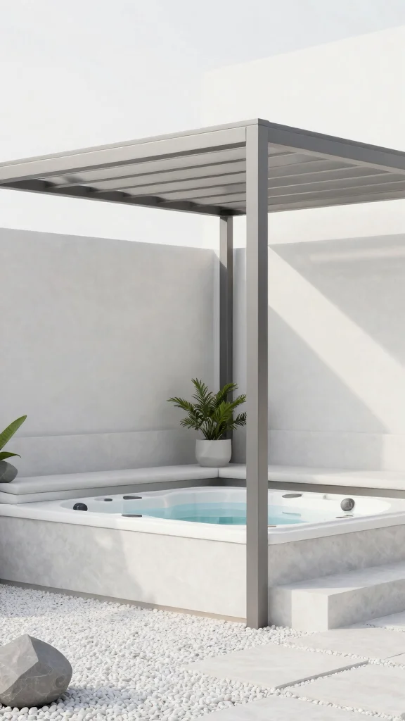 If sleek and contemporary is your style, a modern minimalist pergola is an ideal choice. This design showcases clean lines and understated elegance, using materials like metal or painted wood for a sophisticated look. With a focus on simplicity, your hot tub becomes the star of your outdoor oasis, drawing the eye in effortlessly.